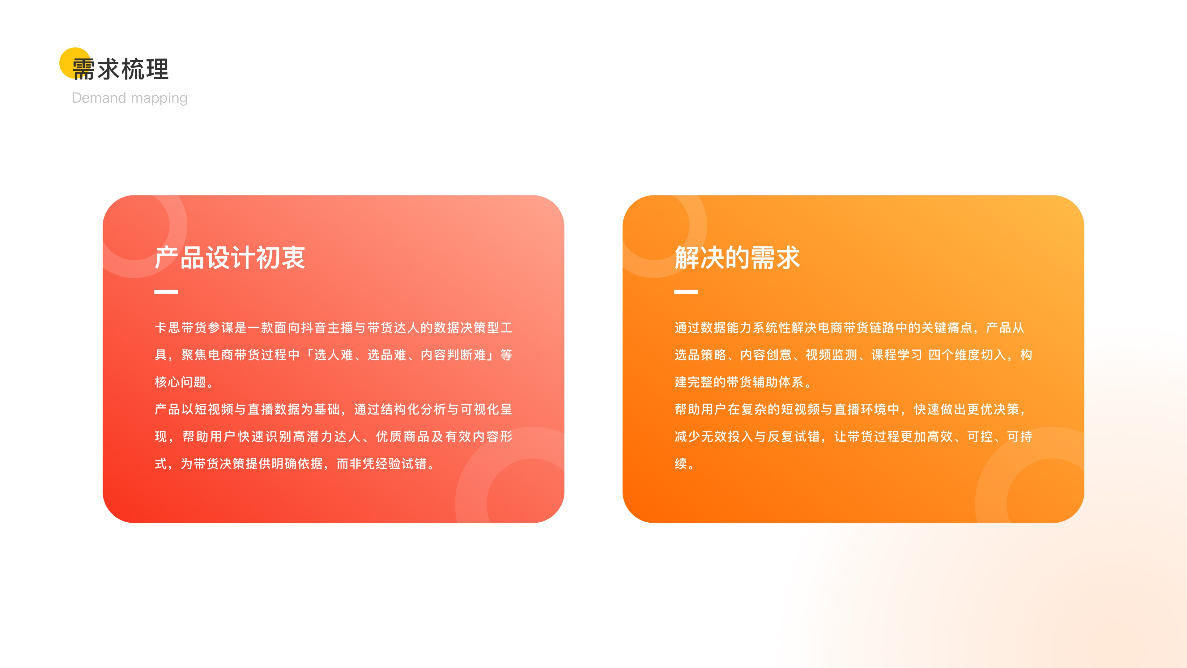 With the explosive growth of short-video e-commerce, live streamers, influencers, and brands face challenges such as product selection difficulties, finding suitable collaborators, and navigating industry trends during sales promotions. As a professional institution in the new media data service sector, Kas Data possesses extensive short video data resources. Leveraging the convenience of mini-programs as a platform, we aim to integrate these data resources and provide users with comprehensive data services covering the entire short video e-commerce supply chain. This initiative helps users navigate the short video e-commerce landscape more efficiently, enhancing sales effectiveness and outcomes. Consequently, we have launched the design project for the Kas Sales Advisor (TikTok Edition) mini-program.